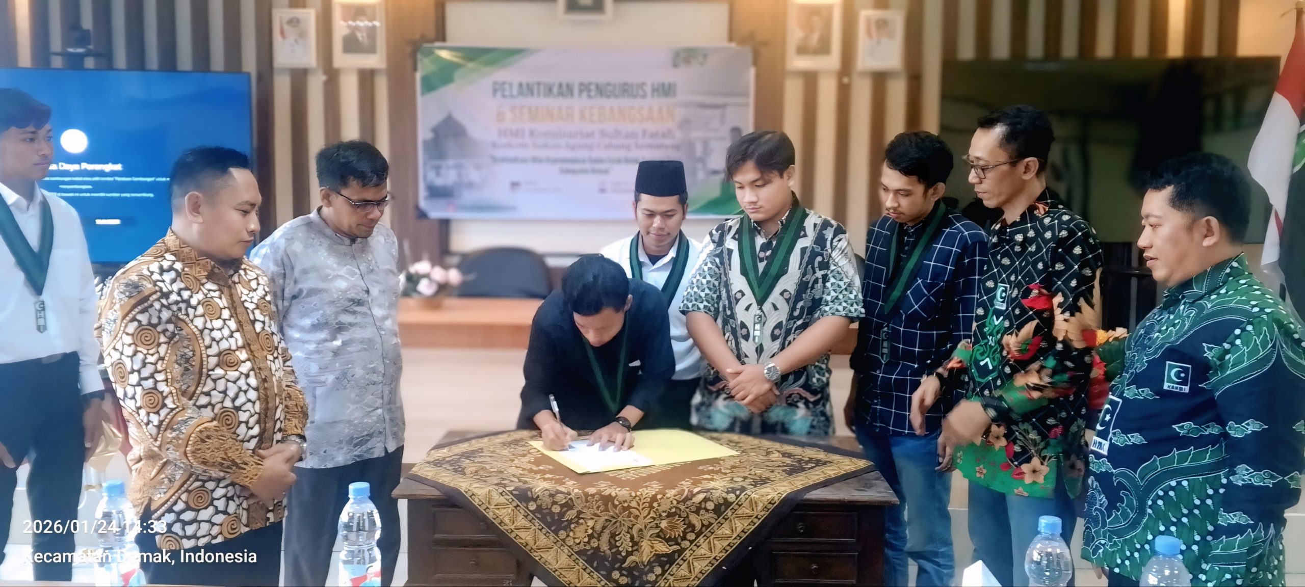 Demak, PikiranBangsa.co – Himpunan Mahasiswa Islam (HMI) Komisariat Sultan Fatah, Korkom Sultan Agung Cabang Semarang, resmi melantik jajaran pengurus baru untuk masa bakti 2026/2027. Acara yang berlangsung di Aula Lt. 2 Bakesbangpol Kabupaten Demak ini dirangkai dengan Seminar Kebangsaan bertajuk “Reaktualisasi Nilai Kepemimpinan Raden Fatah Untuk Generasi Emas Kabupaten Demak”, Sabtu (24/1/2026).