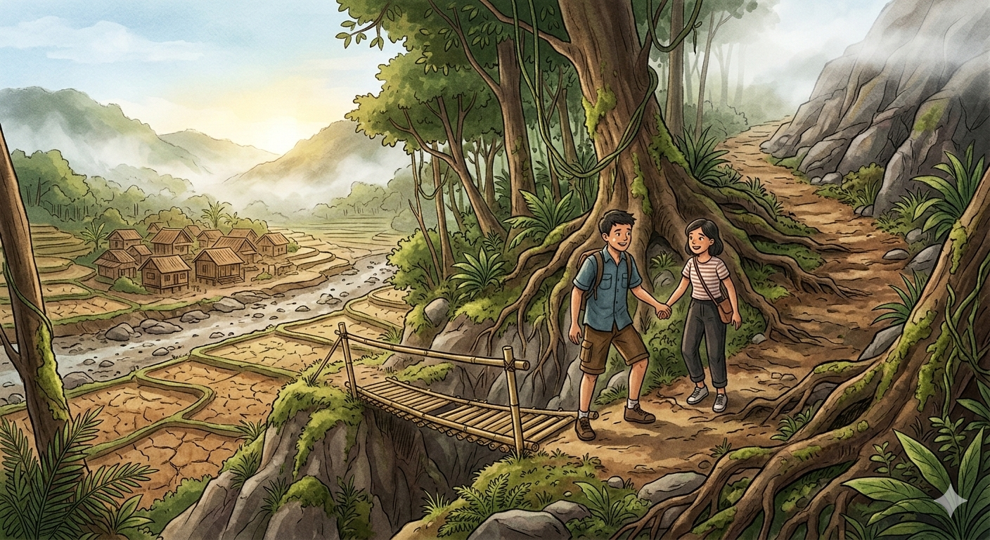 “Kalo jembatan ini patah saat kita lewati, kita bisa jatuh,” bisik Putri dengan wajah cemas.